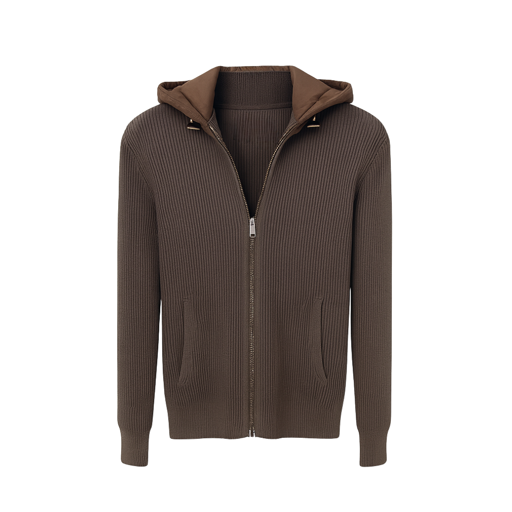 A refined take on casual comfort. The Arden Ribbed Knit Cardigan features a structured ribbed texture combined with a lightly padded hood, creating a perfect balance between warmth and modern design.